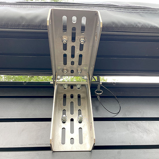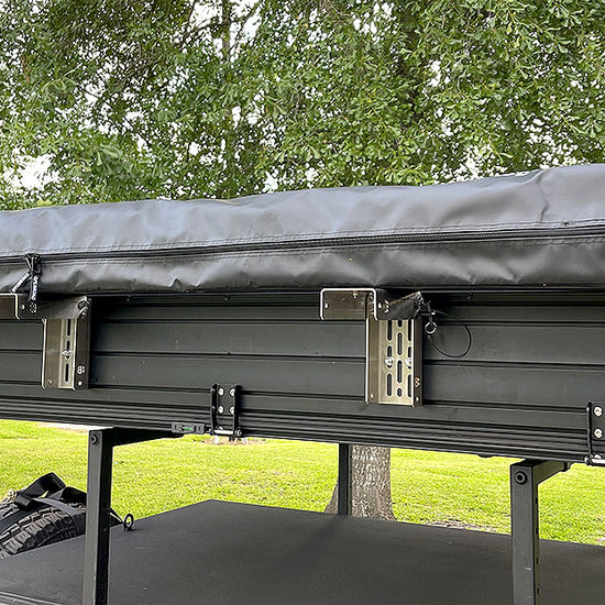 We designed these stainless steel Adjustable Awning / Accessory Brackets in collaboration with John Hartel from Gator Overland. John had a great idea to get the awning to work with the Roofnest tent track. The brackets have flexible mounting holes for mounting to multiple types of track and situations.