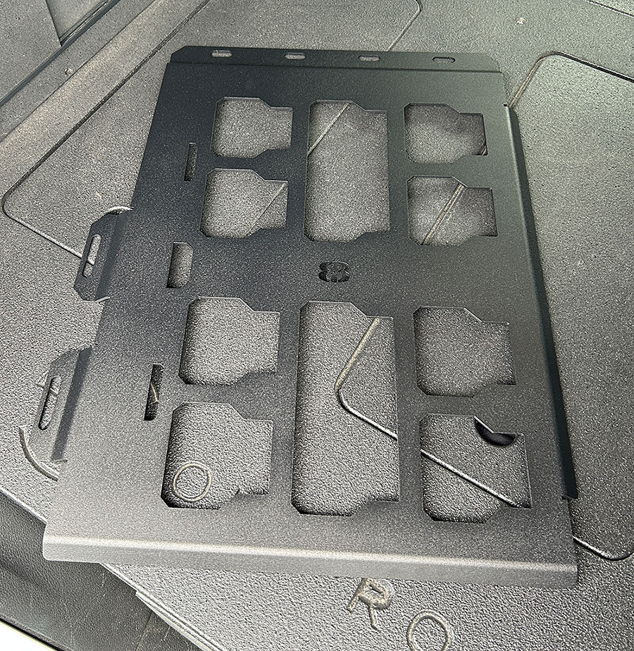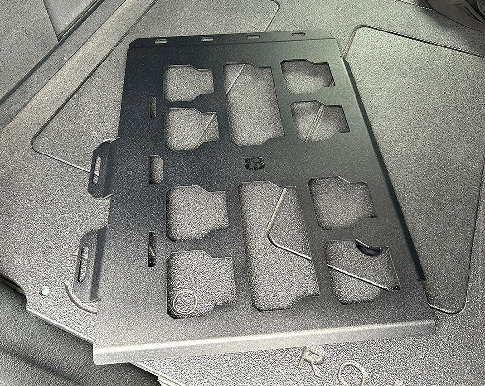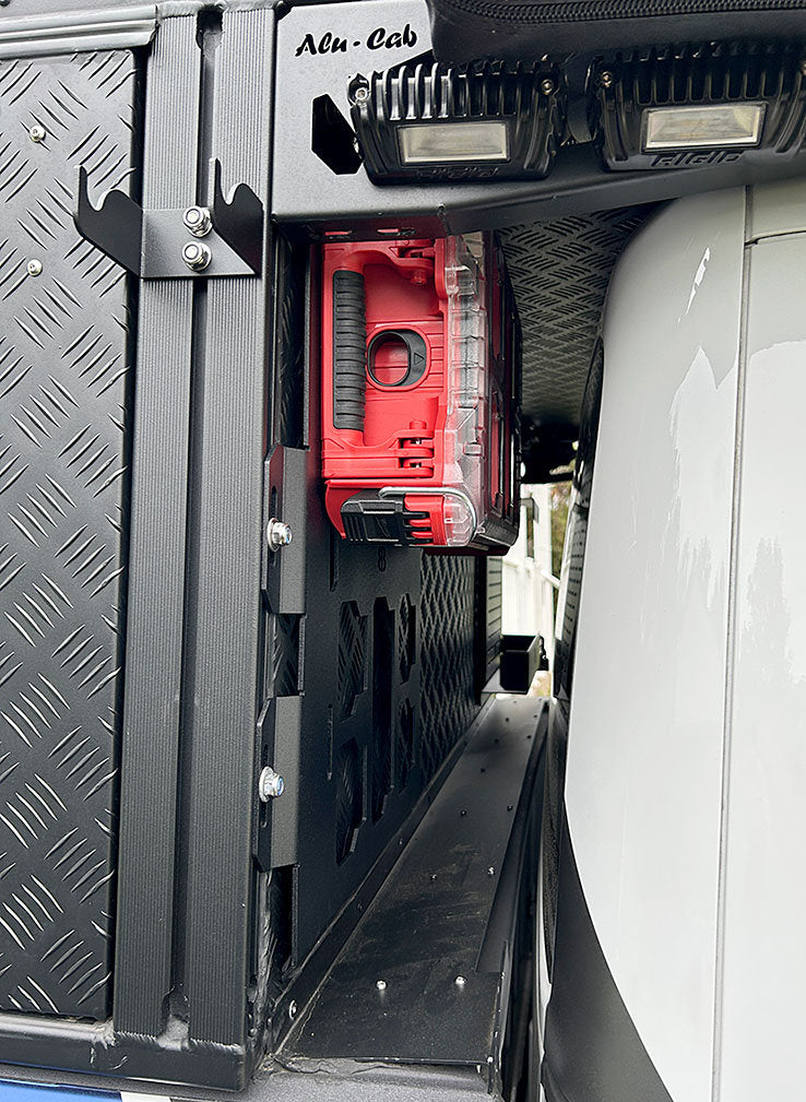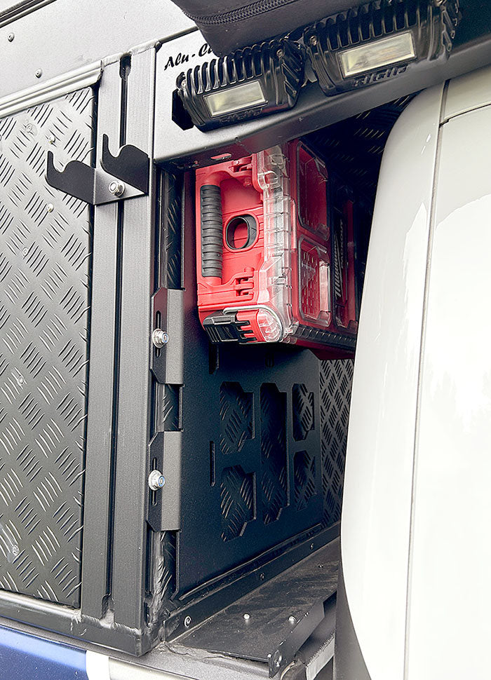 The Alu-Cab Mid-Size Camper / ModCAP PACKOUT VersaPlate for the Passenger side of the camper. If your Alu-Cab Camper / ModCAP has open space between the camper and cab you can use our PACKOUT VersaPlate for mounting two compact or low-profile compact organizers, depending on your application.