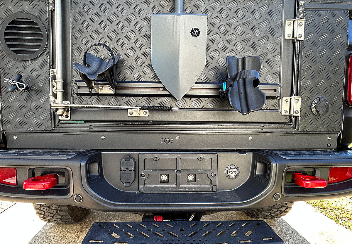 The lower filler panel is designed to fill in the gap between the bottom of the rear door and the Jeep Gladiator bumper. We offer a solid version as well as a version to mount your rear backup camera. With the rear backup camera version there is also an optional camera extension cable available. With the filler panel, you can hide any propane lines or electrical wiring that may be running under the rear of the camper.