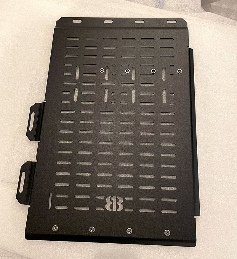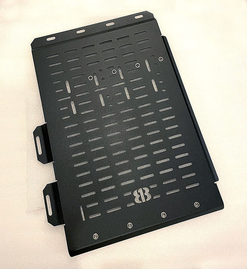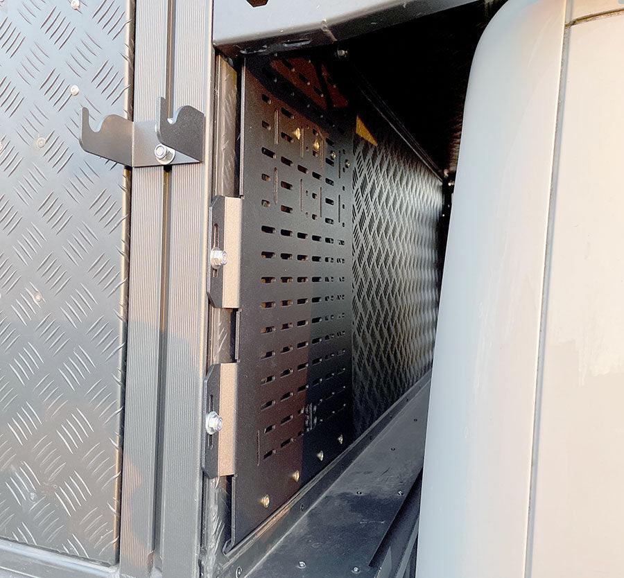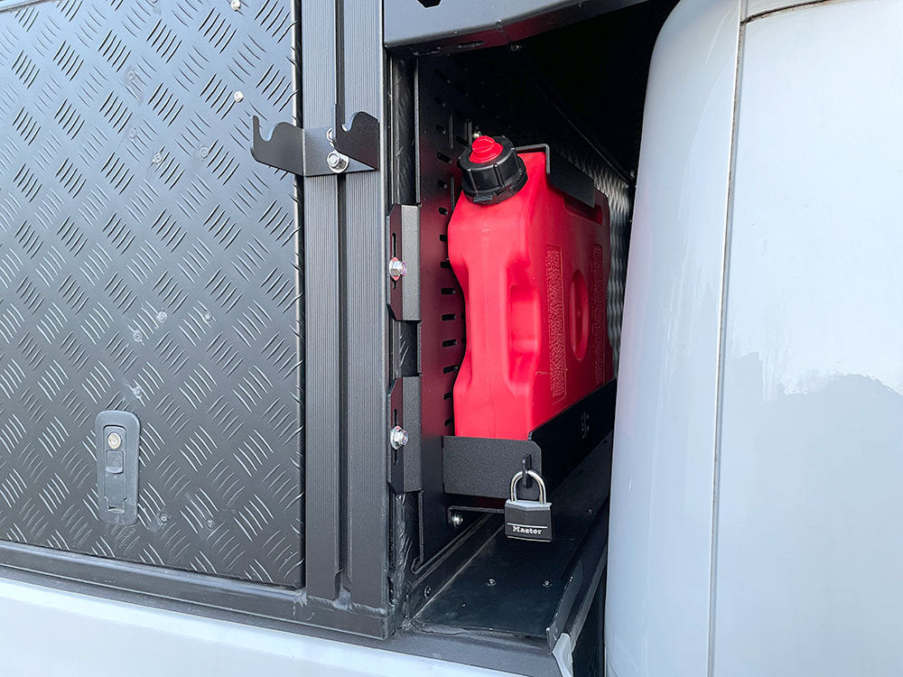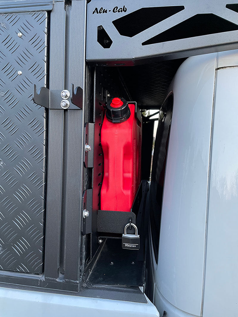 The Alu-Cab Mid-Size Camper / ModCAP VersaPlate for the Passenger side of the camper. If your Alu-Cab Mid-Size Camper / ModCAP has open space between the camper and cab you can use our VersaPlate for mounting extra gear on the outside of the camper. There are also holes in the VersaPlate for mounting an ARB compressor. You can use our RotopaX Mounting Plates (Sold Separately) to carry a 2Gal RotopaX container.
