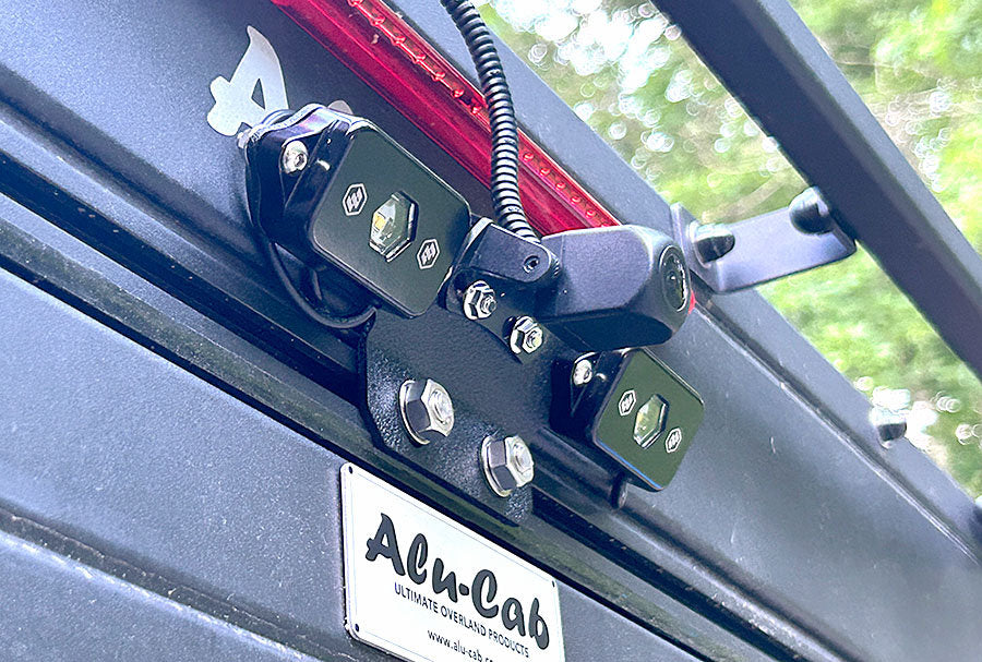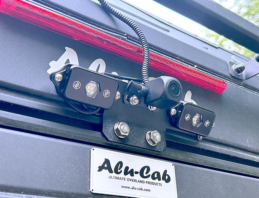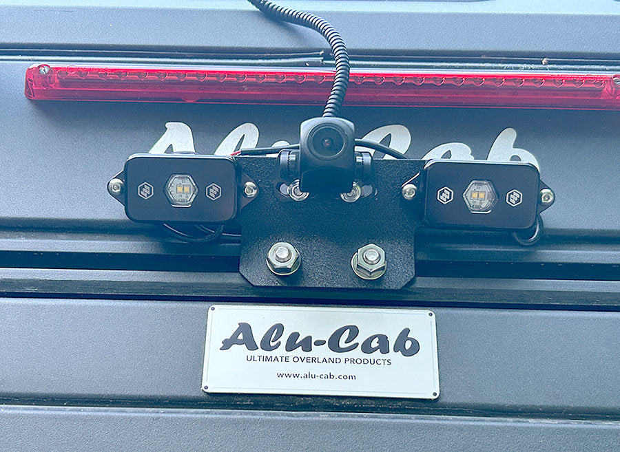 Our aluminum Baja Designs / Rear Camera Combo Bracket is made to fit aftermarket cameras like the Brandmotion Fullvue alongside two Baja Designs Rock Lights. The bracket is fits great above the rear door on the Alu-Cab Canopy Camper / Alu-Cabin but also works great on bed racks, rear tire carriers, roof top tents with track built-in, etc. The possibilities of this small plate are endless for your application.
