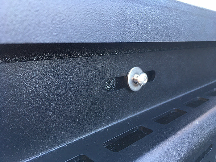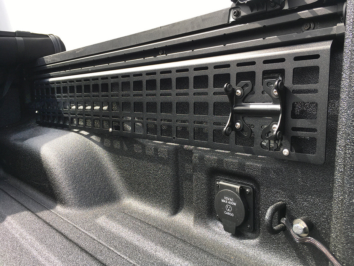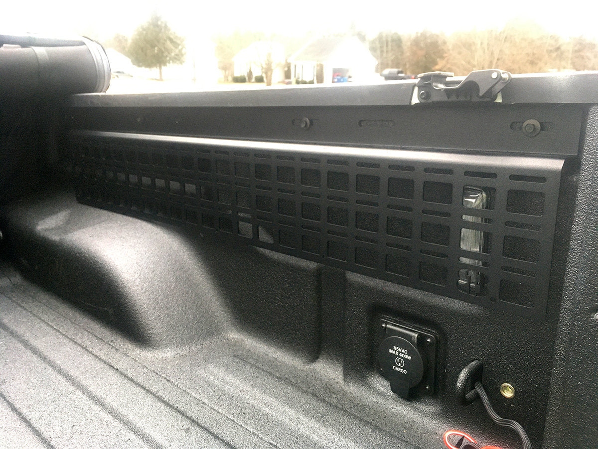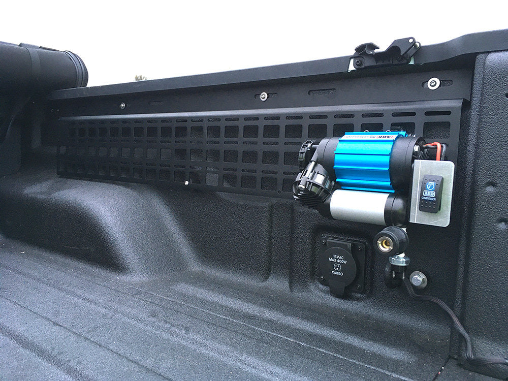 Our Jeep Gladiator Aluminum Half MOLLE Panel is designed to mount with or without the Mopar Trail Rails on the Driver or Passenger side of the bed. This panel has PALS compatible MOLLE holes with the correct spacing throughout the panel. This upper panel also has correctly spaced holes for mounting the ARB Single compressor anywhere along the panel. This is the same upper panel used in our full MOLLE panel setup.