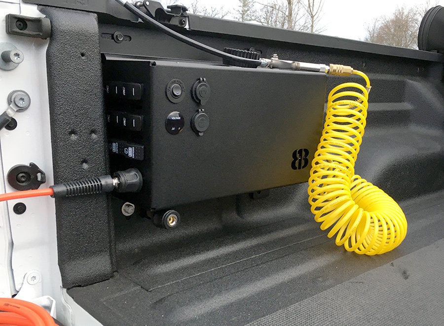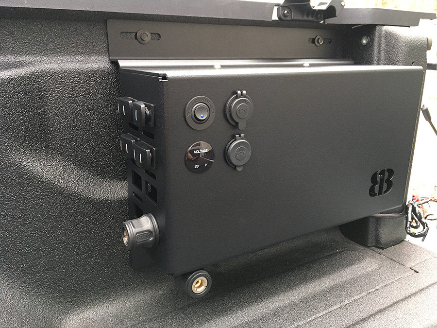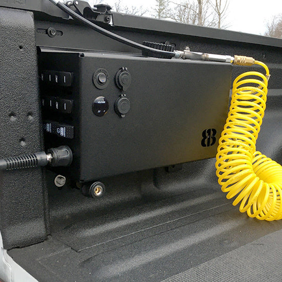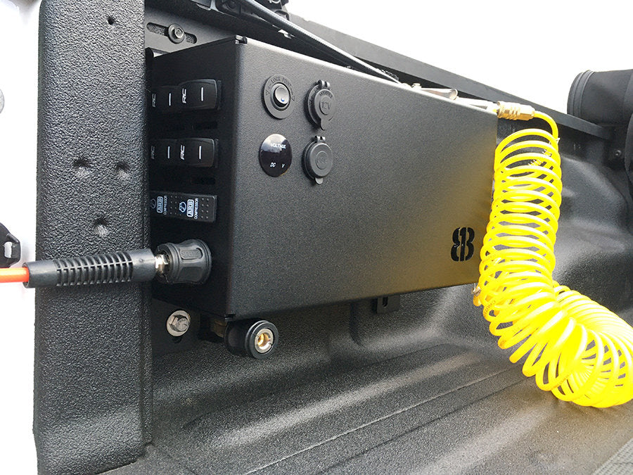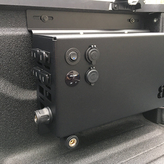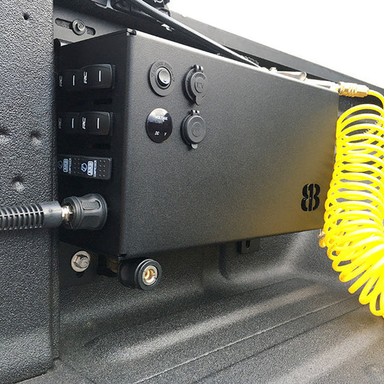 Our Aluminum Jeep Gladiator Bed Side Large Compressor Enclosure for the ARB Single and Twin Compressors, including the new brushless compressors. The enclosure mounts under or without the Trail Rails on either side of the bed. The enclosure is super flexible for your Overlanding and Off-roading adventures! The cover has four 30mm holes to hold 12V accessories. There are a total of 15 rocker switch holes that also double as a MOLLE grid to mount a small MOLLE bag for air accessories. The enclosure also has 3 air coupler holes. There is enough room inside the enclosure to hold the ARB Twin as well as the ARB Locker Manifold and locker solenoids. If not using the manifold for lockers you can use the area for a mounting a fuse block to go along with your electronics. If you have a need to control lighting, accessories, etc for Overlanding, you can use this enclosure as one central control center! The enclosure is American Made with 1/8" aluminum and powder coated in texture black.