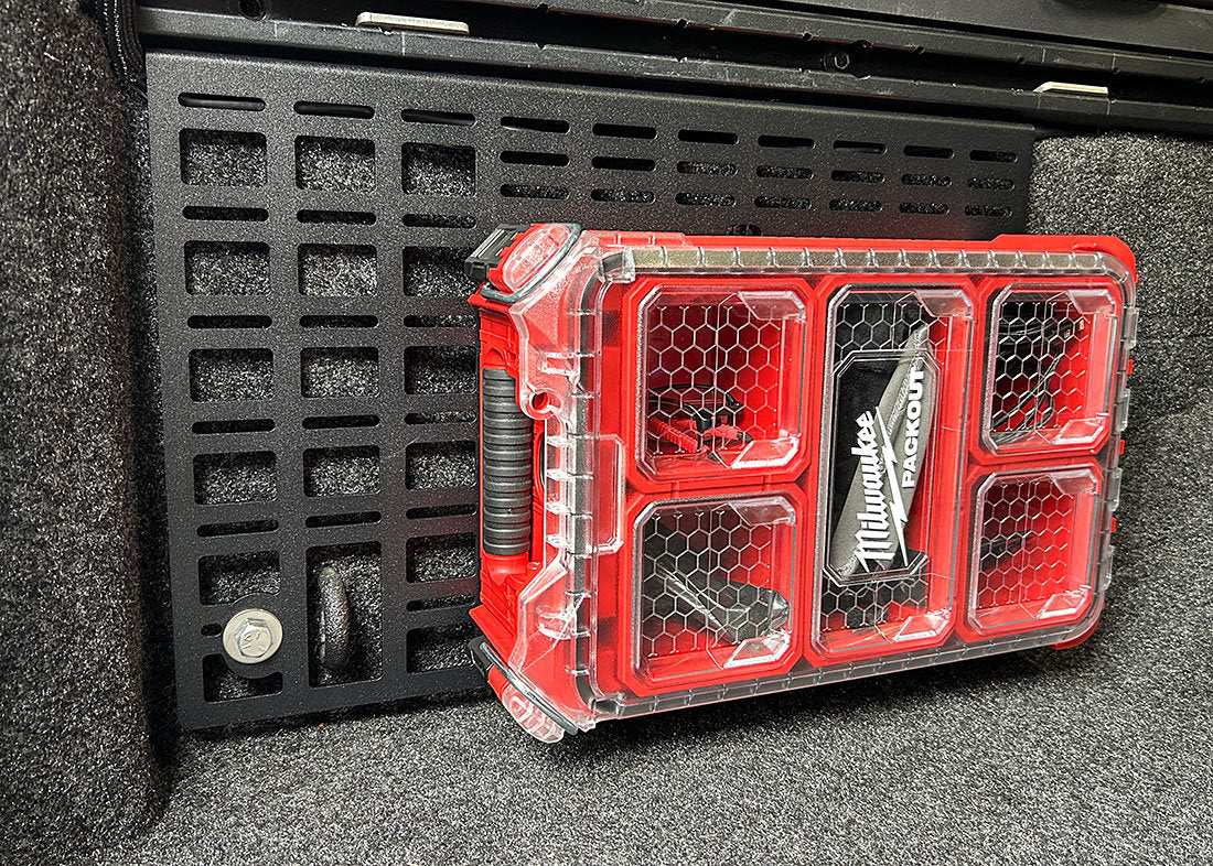 Our Jeep Gladiator Aluminum PACKOUT / MOLLE Panel. Designed to hold a Compact or Low-Profile Compact Organizer along with a small MOLLE area and slot area for accessories. The panel is designed to mount with or without the Mopar Trail Rails on the Driver Side ONLY of the bed. This panel has PALS compatible MOLLE holes with the correct spacing throughout the left side of the panel.