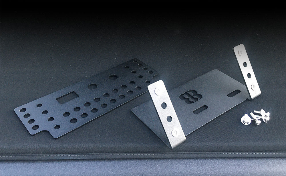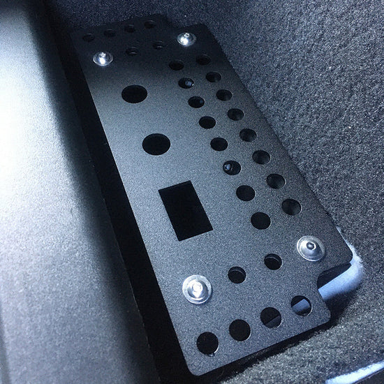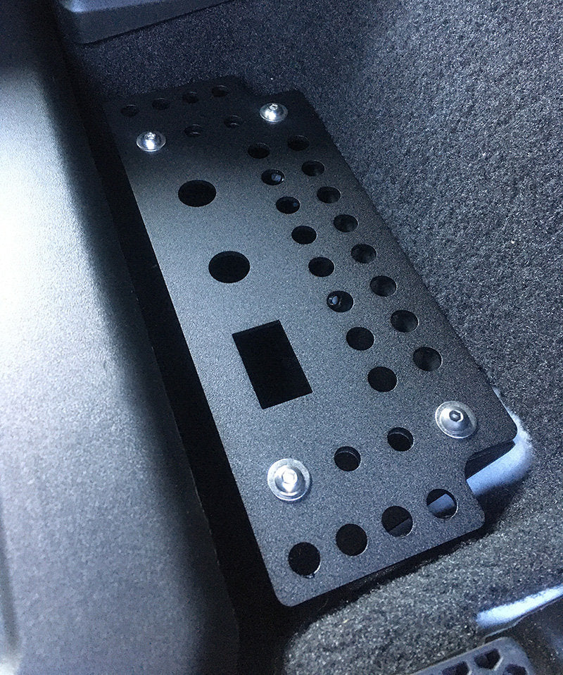 Fits under the Jeep Gladiator rear driver's side seat. This plate and mount are designed to replace the stock Jeep Gladiator hardware box that holds the removable hardware from doors, windshield, etc. This plate also includes 4 extra holes to hold the door stop bolts when the doors are removed. Jeep did not include holes for these bolts in the stock hardware box.