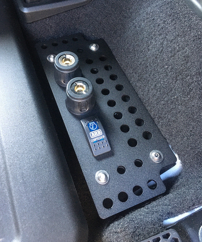 The switch plate was designed around the ARB JIC-4 (model # 0740111) Air chuck, as it is low-profile and a panel/direct mount air chuck. Other air chuck setups will work as long as the air chuck doesn't stand too tall and prevent the seat from sitting in the correct position. See our air line setup video for more information.