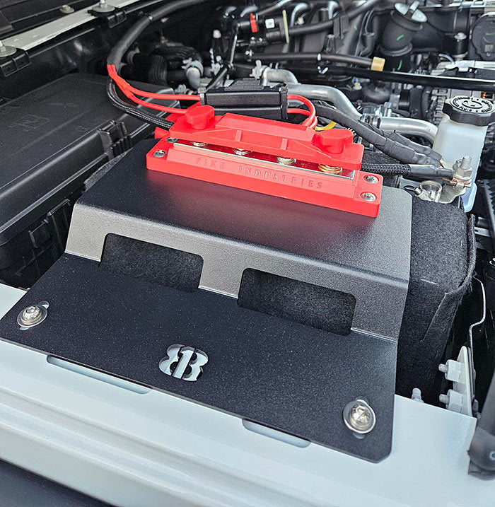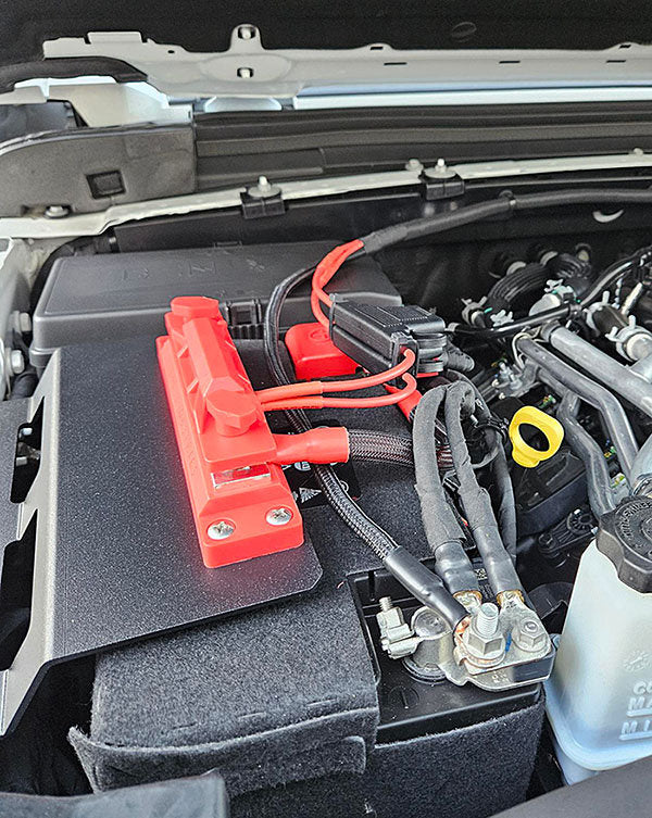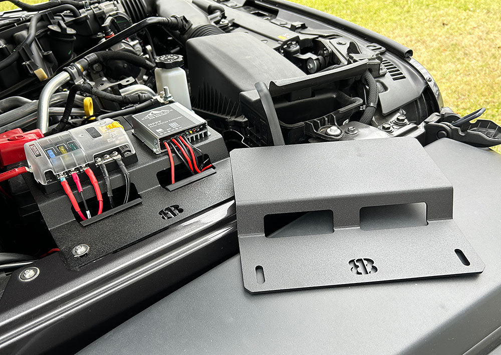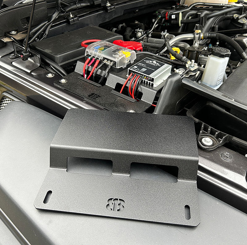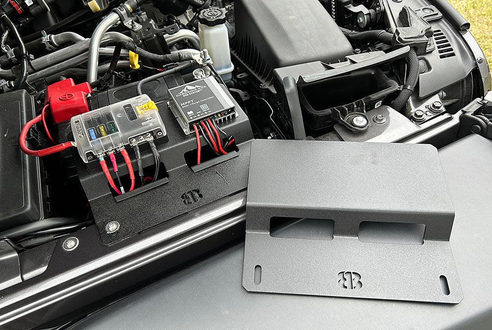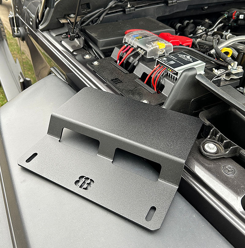 Our new Electrical/Accessory Plate for the Jeep Gladiator/Jeep JL. With this plate you can mount a number of electrical accessories such as fuse blocks, fuses, bus bars, DC to DC charge controllers, MPPT charge controllers, etc. The plate is a blank slate for your needs. The plate is designed to mount over the battery of the Jeep Gladiator or Jeep JL gas models. The plate does also fit over the fuse box of the diesel models but DOES NOT fit over the 392 fuse box.