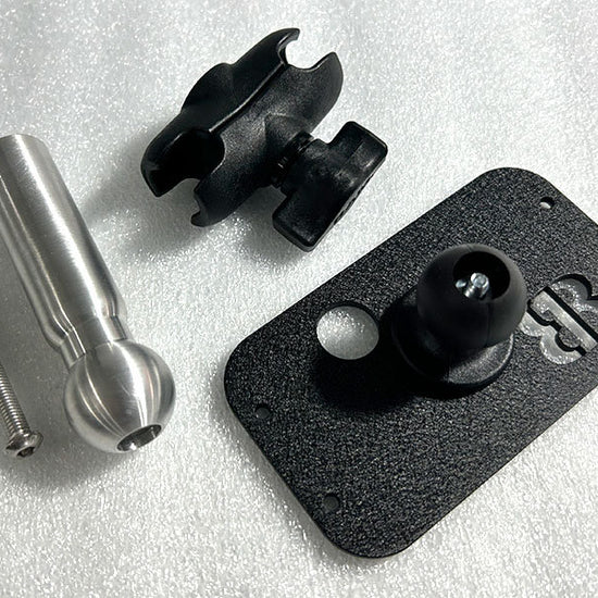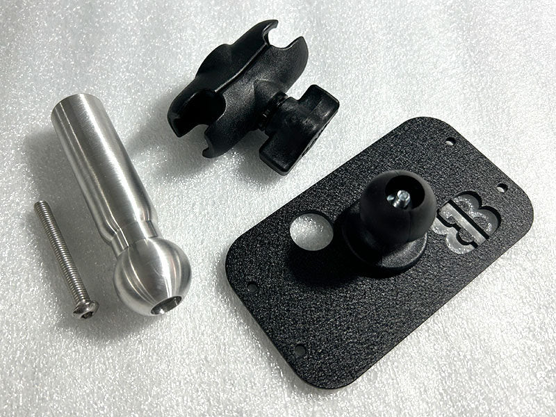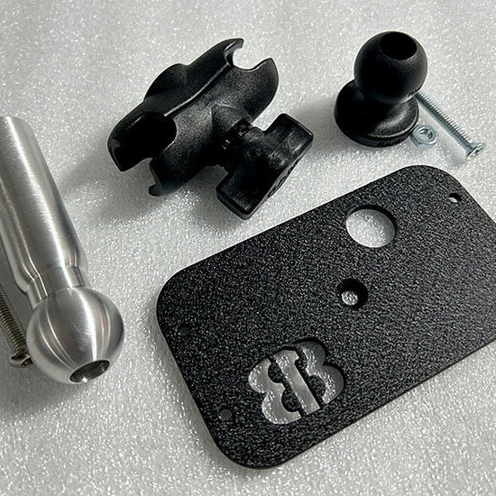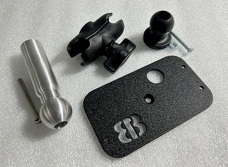 Included with the kit: Black texture powder coated aluminum switch panel mount, low profile screws, washers and nuts, 1" RAM ball mount, A-Pillar aluminum ball mount and RAM Mount adapter. Auxbeam 8-Gang Switch Panel not included.
