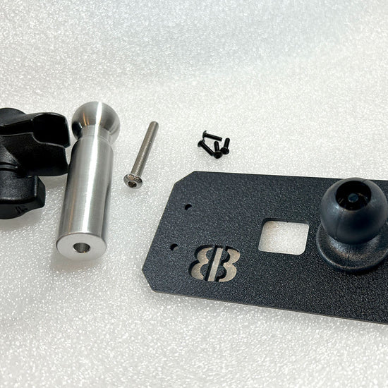 Included with the kit: Black texture powder coated aluminum switch panel mount, low profile screws, washers and nuts, 1" RAM ball mount, A-Pillar aluminum ball mount and RAM Mount adapter.
