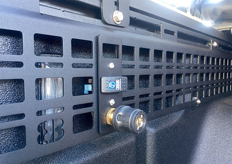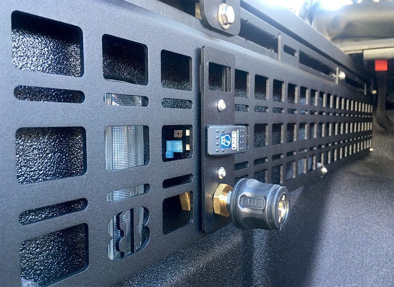 Rocker Switch / Air Coupler Combo Plate that mounts directly to our bed-mounted MOLLE Panels. There are two holes for rocker switches and one hole for an air coupler. The rocker switch hole is sized for rocker switches that fit 38.10 x 25.4 holes. A direct fit for ARB rocker switches. The air chuck hole is 3/4" (though a little tight with powder coat).