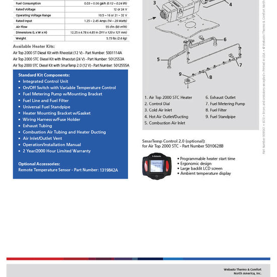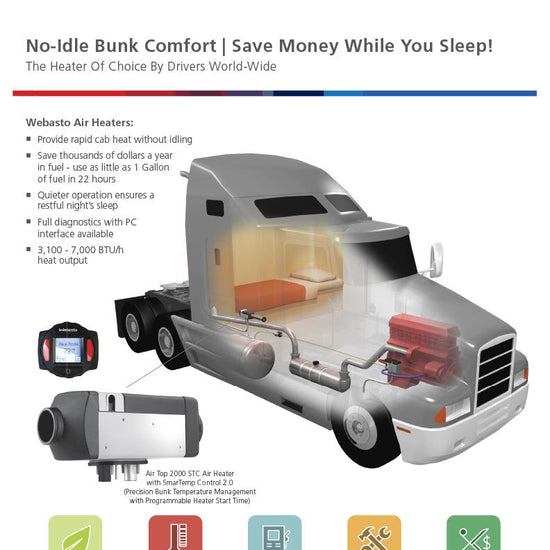 Genuine Webasto Air Top 2000 STC Air heater kit. With an output range of 3070 BTU to 7000 BTU ( .9 kilowatt - 2 kilowatt ) the AT2000STC air heater can provide heat for up to 22 hours on 1 gallon of diesel fuel. Webasto air and coolant heaters are used extensively in commercial truck applications and are a certified idle reduction device. Investing in a Webasto diesel bunk heater for your sleeper will save fuel, save maintenance, save money and save pollution.